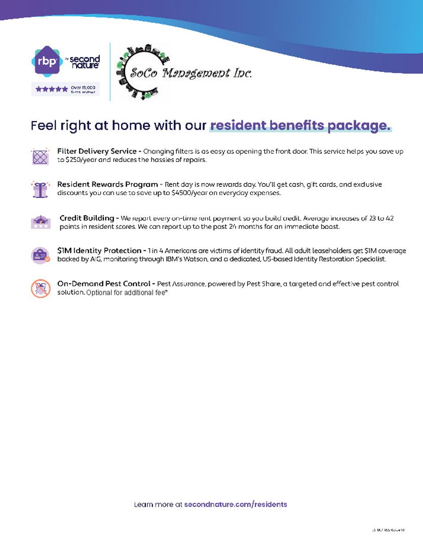At SoCo Management, we aim to make renting cost-effective, convenient, and stress-free. Every property includes our required Resident Benefits Package (RBP)—designed to simplify life and add value for our residents. Choose between our Standard or Premium package at time of application.